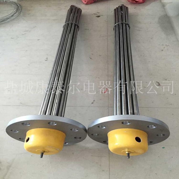 法蘭式不銹鋼加熱管(也稱插入式電加熱管):是采用U型管狀電熱元件,依據加熱不同介質設計規范,按照功率配置要求裝配在法蘭蓋上,插入需加熱物料中,發熱元件工作時所發出的大量熱量傳導給被加熱介質使介質溫度升高,達到所需的工藝要求。
